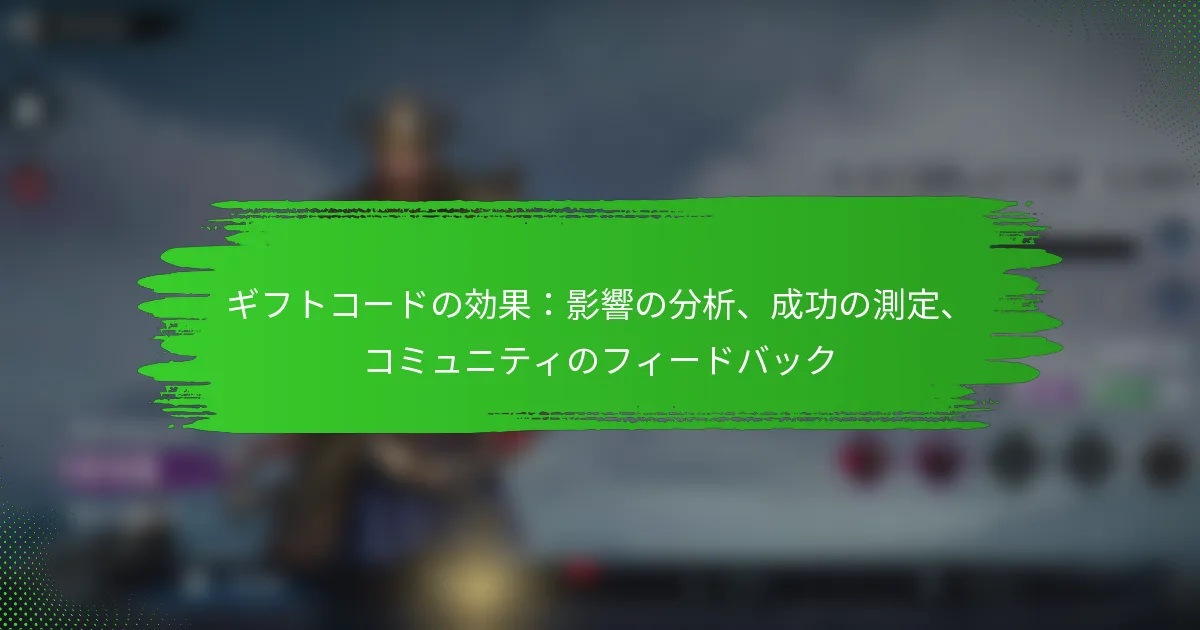 ギフトコードは、ユーザーが引き換えた際に特定の利益を提供する英数字の文字列であり、オンラインショッピングやゲームにおけるデジタル通貨として機能します。その効果を分析するには、引き換え率やユーザーフィードバックなどの指標を詳しく見る必要があり、これによりエンゲージメントやビジネスパフォーマンスへの影響が明らかになります。戦略的にターゲットオーディエンスを設定し、パーソナライズされたマーケティング活動を統合することで、企業はギフトコードの効果を最大化し、顧客のロイヤルティを育むことができます。 ギフトコードとは何か、どのように機能するのか? ギフトコードは、引き換え時にユーザーに特定の価値や利益を提供する英数字の文字列です。これらはデジタル形式の通貨またはクレジットとして機能し、オンラインショッピングやゲームプラットフォームでユーザー体験を向上させるために使用されます。 さまざまな文脈におけるギフトコードの定義 小売業界では、ギフトコードは通常、顧客が購入に適用できる前払いのクレジットの一形態として使用されます。これらのコードは、小売業者や第三者サービスによって発行され、しばしば贈り物として提供されます。 ゲーム業界では、ギフトコードはしばしばゲーム内通貨、アイテム、または特別な機能をアンロックし、ゲームプレイやユーザーエンゲージメントを向上させます。これらは、プレイヤーが新しいコンテンツを探索したり、ゲームに戻ったりするためのインセンティブとして機能します。 デジタルサービスでは、ギフトコードはサブスクリプションやプレミアム機能へのアクセスを提供し、ユーザーが前払いなしで機能を向上させることができます。 ギフトコードの引き換えメカニズム ギフトコードを引き換えるには、ユーザーは通常、ウェブサイトやアプリの特定のセクションに移動する必要があり、通常は「コードを引き換える」または「ギフトカード」とラベル付けされています。コードを入力すると、システムはその有効性を確認し、対応する価値をユーザーのアカウントに適用します。 ギフトコードを引き換えるための一般的な手順は以下の通りです: プラットフォーム上のギフトコード入力フィールドを見つける。 英数字コードを正確に入力する。 通常は「適用」または「引き換え」とラベル付けされたボタンを通じて引き換えを確認する。 ユーザーは、利益を失わないように、指定された有効期限内にコードを入力していることを確認する必要があります。 ギフトコードの一般的な使用例 ギフトコードは、以下のようなさまざまなシナリオで広く使用されています: 誕生日や休日などの贈り物の機会に、受取人が好みのアイテムを選べるようにする。 新しい顧客を引き付けたり、忠実な顧客を報いるために企業がコードを提供するプロモーションキャンペーン。 ブランドとのインタラクションを促すために、アンケートの完了やイベントへの参加などのユーザーエンゲージメントのインセンティブ。 これらのアプリケーションは、顧客満足度を向上させ、売上を促進する上でのギフトコードの多様性を強調しています。 ギフトコードと割引コードの違い 特徴 ギフトコード 割引コード 目的