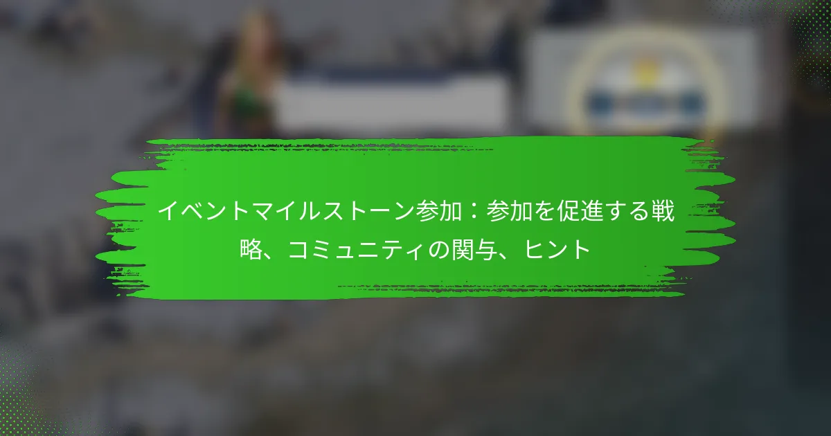 マイルストーンイベントに参加者を引き込むことは、記憶に残る体験を創出し、コミュニティのつながりを育むために重要です。インタラクティブなアクティビティを実施し、地域の関与を促進することで、主催者は参加者数を増やし、全体の雰囲気を豊かにすることができます。物流、包括性、効果的なプロモーションに焦点を当てることで、これらのイベントが参加者に響き、意味のある参加を促すことがさらに確実になります。 マイルストーンイベントに参加者を引き込むための効果的な戦略は何ですか? マイルストーンイベントに参加者を引き込むための効果的な戦略には、インタラクティブなアクティビティ、コミュニティ構築の取り組み、テクノロジーの活用が含まれます。これらのアプローチは、参加者間の関与とつながりを促進する活気ある雰囲気を育みます。 参加者の関与を高めるインタラクティブなアクティビティ インタラクティブなアクティビティは、参加者を引き込むために不可欠であり、イベントを記憶に残るものにします。ワークショップ、ライブデモンストレーション、またはハンズオン体験などのオプションは、参加者の相互作用を大幅に増加させることができます。たとえば、イベントのテーマに関連するゲームやチャレンジを取り入れることを検討してください。 もう一つの効果的なアプローチは、参加者が特定のトピックについて協力できるブレイクアウトセッションを作成することです。これは、関与を促進するだけでなく、ネットワーキングの機会も提供します。これらのセッションが参加を最大化するために適切にファシリテートされることを確認してください。 リアルタイムのフィードバックを促すために、ライブポールやQ&Aセッションを取り入れる。 参加のインセンティブとして、賞品や認識を提供する。 プレゼンテーションやディスカッションを強化するために、視覚的な補助具やテクノロジーを活用する。 コミュニティ構築を通じて帰属意識を創出する コミュニティの感覚を築くことは、参加者の関与にとって重要です。これは、アイスブレイカーアクティビティやグループディスカッションを通じて参加者間のつながりを育むことで達成できます。参加者が自分の経験や洞察を共有することを奨励し、より包括的な環境を作り出すことができます。 歓迎する雰囲気を確立することも重要です。参加者が認識されていると感じるために、名札やパーソナライズされたウェルカムメッセージを使用することを検討してください。さらに、ネットワーキングのための指定エリアを作成することで、相互作用を促進し、コミュニティの絆を強化できます。 イベント前に興味に基づくグループやフォーラムに参加するよう参加者を奨励する。 共通の目標や価値を強調して参加者を団結させる。 イベント後にコミュニティニュースレターやソーシャルメディアグループでフォローアップする。 テクノロジーを活用して関与を促進する テクノロジーは、マイルストーンイベント中の参加者の関与を高める上で重要な役割を果たします。イベントアプリを活用することで、コミュニケーションを円滑にし、スケジュールを提供し、参加者間のネットワーキングを促進できます。これらのツールは、リアルタイムの更新や発表も可能にします。 バーチャルリアリティ(VR)や拡張現実(AR)体験は、参加者をイベントにさらに没入させることができます。これらのテクノロジーは、従来の方法では再現できないユニークな相互作用を生み出すことができます。ただし、テクノロジーがすべての参加者にとって使いやすく、アクセス可能であることを確認してください。 リモート参加者のためにライブストリーミングを実施してリーチを増やす。 ソーシャルメディアプラットフォームを使用して、体験を共有するためのイベントハッシュタグを作成する。 アプリ内で参加を促すためにゲーミフィケーション要素を検討する。 継続的な改善のためのフィードバックメカニズムを取り入れる フィードバックメカニズムは、参加者の体験を理解し、今後のイベントを改善するために重要です。アンケートやフィードバックフォームを実施することで、何がうまくいったか、何を改善する必要があるかについて貴重な洞察を得ることができます。包括的なデータを得るために、イベント中および後にフィードバックを収集することを目指してください。 イベント中にオープンダイアログを奨励し、参加者がリアルタイムで自分の考えを共有できるようにします。これは、ファシリテートされたディスカッションやフィードバックステーションを通じて行うことができます。参加者の意見が重要であることを示すために、受け取ったフィードバックに対して認識し、行動を起こすことを確認してください。 匿名のフィードバックツールを使用して、正直な回答を促す。