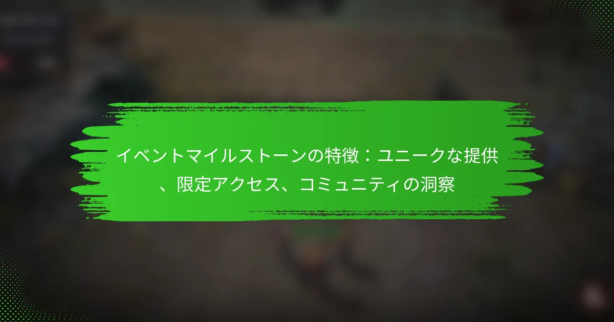 イベントのマイルストーンは、参加者を魅了し、革新的な形式や独自のインサイトへのアクセスを通じてコラボレーションを促進するユニークな体験を提供します。さまざまなチケットオプションやメンバーシッププログラムを提供することで、参加者はVIP体験や貴重なネットワーキングの機会を楽しむことができます。さらに、コミュニティのインサイトは、今後のイベントを形作る上で重要な役割を果たし、参加者のニーズに応じて魅力的で関連性のあるものを維持します。 イベントのマイルストーンのユニークな提供内容とは? イベントのマイルストーンのユニークな提供内容には、参加者を引き込む独特の体験、参加を促進する革新的な形式、そしてインサイトやネットワーキングの機会への独自のアクセスが含まれます。これらの要素は、コミュニティとコラボレーションを促進する記憶に残るイベントを共同で創出します。 参加者体験を向上させる独特の活動 独特の活動は、参加者を魅了し、積極的な参加を促すように設計されています。例としては、インタラクティブなワークショップ、実践的なデモンストレーション、参加者がコンテンツに直接関与できる没入型体験などがあります。 ゲーミフィケーション要素を取り入れることで、これらの活動をさらに向上させ、学びを楽しく競争的にすることができます。例えば、スカベンジャーハントやチームチャレンジは、参加者が楽しみながらネットワーキングやコラボレーションを促す動機付けとなります。 活動に地域文化の要素を統合することで、場所の感覚を創出することを検討してください。これには、地元の料理の試食、アートの展示、参加者をホスト都市とつなげるコミュニティサービスプロジェクトなどが含まれます。 イベントを際立たせる革新的な形式 革新的なイベント形式は、参加者のエンゲージメントと満足度に大きな影響を与えることができます。参加者がアジェンダを決定するアンカンファレンスや、対面とバーチャルな体験を融合させたハイブリッドイベントなどの形式が人気を集めています。 もう一つの効果的な形式は、特定の興味に応じたブレイクアウトセッションの利用です。これにより、参加者は自分に響くトピックを選ぶことができます。このパーソナライズは、全体的な体験を向上させ、参加者間のより深いつながりを促進します。 ライブポーリングやQ&Aセッションなどのテクノロジーを活用することで、よりダイナミックな環境を創出することもできます。これらのツールはリアルタイムのインタラクションやフィードバックを促し、参加者がイベントにより関与していると感じさせます。 特別ゲストスピーカーとその影響 影響力のあるゲストスピーカーを招くことで、イベントのプロファイルを高め、参加者を引き寄せることができます。著名な専門家や業界リーダーは、参加者に響く貴重なインサイト、インスピレーションを与えるストーリー、実用的なアドバイスを共有できます。 スピーカーはイベントのテーマや参加者の興味に合致することが重要です。彼らが参加者と関わり、つながる能力は、全体的な体験を大幅に向上させ、持続的な価値を提供します。 参加者がQ&Aセッションやミート&グリートイベントを通じてスピーカーと交流する機会を提供することを検討してください。この個人的なタッチは、記憶に残る体験を創出し、より深いつながりを促進します。 ユニークなネットワーキングの機会 ユニークなネットワーキングの機会は、参加者間の関係構築とコラボレーションを促進するために重要です。スピードネットワーキングやテーマ別のラウンドテーブルディスカッションなどの構造化されたネットワーキングセッションは、意味のあるつながりを促進します。 カクテルレセプションやグループ外出などの社交活動を取り入れることで、ネットワーキング体験をさらに向上させることができます。これらの非公式な設定は、よりリラックスした会話や参加者間の強い絆を生むことがよくあります。 共通の興味に基づいてつながりを促進するイベントアプリなどのテクノロジーを活用することで、ネットワーキングをさらに強化できます。参加者は、イベント中や終了後に潜在的なコラボレーターやメンターを簡単に特定し、連絡を取ることができます。 成功した過去のイベントのケーススタディ 成功した過去のイベントを検討することで、効果的な戦略やユニークな提供内容に関する貴重なインサイトを得ることができます。例えば、実践的なワークショップとライブデモを統合したテクノロジーカンファレンスは、参加者の満足度とエンゲージメントが大幅に向上しました。 もう一つの例は、地元のアーティストや文化活動をフィーチャーしたコミュニティ中心のフェスティバルで、参加者を惹きつけるだけでなく、コミュニティ内に誇りとつながりの感覚を育みました。 これらのケーススタディ