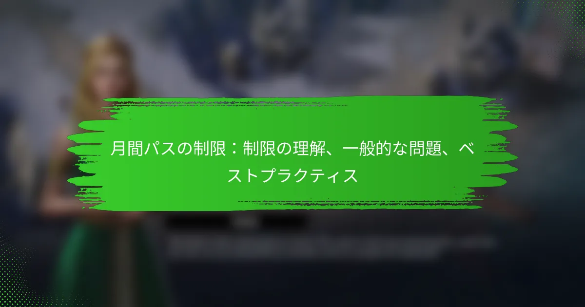 月間パスは大きな価値を提供することがありますが、ユーザーが認識しておくべき特定の制限が伴うことがよくあります。これらの制限を理解することは、期限切れのパスや技術的な問題などの一般的な問題を避けるために不可欠であり、アクセスを妨げ、フラストレーションにつながる可能性があります。使用を戦略的に計画し、潜在的な落とし穴に注意を払うことで、ユーザーは月間パスの利点を最大限に引き出すことができます。 月間パスの主な制限は何ですか? 月間パスには、使用方法や使用時期に影響を与えるさまざまな制限が伴うことがよくあります。これらの制限を理解することは、その価値を最大化し、予期しない問題を避けるために重要です。 使用に関する地理的制限 多くの月間パスは特定の地理的エリアに制限されています。たとえば、公共交通機関のパスは特定の市境や交通ゾーン内でのみ有効な場合があります。ユーザーは、意図した旅行ルートが含まれていることを確認するために、カバレッジマップをチェックする必要があります。 場合によっては、パスが州や地域の境界を越えての旅行を許可することがありますが、追加料金や制限が伴うことがあります。罰則や無効な使用を避けるために、地理的な境界を常に確認してください。 時間に基づく制限と有効期限 月間パスには通常、購入日から始まる定義された有効期限があります。ユーザーは、一部のパスがピーク時や特定の日(祝日や週末など)には無効である可能性があることを認識しておく必要があります。 たとえば、月間ジム会員は特定の時間帯にのみアクセスを許可され、混雑時の使用が制限されることがあります。利用規約を確認することで、フラストレーションを避け、必要なときにアクセスできるようにすることができます。 使用制限と頻度制限 多くの月間パスには使用制限があり、特定の期間内にサービスにアクセスできる回数が制限されています。たとえば、博物館のパスは、月に特定の回数のみ入場を許可する場合があります。 これらの制限を理解することは、限度を超えないようにするために不可欠であり、追加料金が発生する可能性があります。ユーザーは、自分の使用状況を追跡して、許可された限度内に収まるようにする必要があります。 譲渡性と共有ルール ほとんどの月間パスは譲渡不可であり、他の人と共有したり販売したりすることはできません。このルールは、公共交通機関やフィットネスセンターなどのサービスに一般的であり、パスは個々のアカウントにリンクされていることが多いです。 一部のパスは、家族プランなどの限られた共有を許可する場合がありますが、通常は特定の条件が伴います。違反を避けるために、常に利用規約を読み、何が許可されているかを理解してください。 特定のサービスやイベントの除外 月間パスには、プロバイダーによって大きく異なる特定のサービスやイベントが除外されることがよくあります。たとえば、公共交通機関のパスは、特急列車や特別イベントのシャトルをカバーしていない場合があり、別途チケットが必要です。 ユーザーは、予期しないコストを避けるために、除外事項を把握しておく必要があります。細則を確認するか、カスタマーサービスに問い合わせることで、何が含まれているか、何が含まれていないかを明確にすることができます。 ユーザーが月間パスで直面する一般的な問題は何ですか? ユーザーは、期限切れのパス、技術的な問題、利用規約の誤解など、月間パスに関していくつかの課題に直面することがよくあります。これらの問題は、アクセス制限や解決を試みる際のフラストレーションにつながる可能性があります。 期限切れのパスと更新の課題 期限切れのパスは大きな不便を引き起こす可能性があり、ユーザーは依存しているサービスや施設へのアクセスを失うことがあります。多くのプロバイダーには特定の更新期限があり、期限内に更新しないと追加料金が発生したり、特典を失ったりする可能性があります。 問題を避けるために、ユーザーは更新日をリマインダーとして設定し、更新プロセスに慣れておく必要があります。一部のサービスでは、自動更新オプションを提供しており、これによりプロセスが簡素化され、アクセスの中断を防ぐことができます。 パスが予期せず期限切れになった場合は、迅速にカスタマーサービスに連絡することで、状況を明確にし、再発行や更新時の割引オプションを探ることができます。 アクセスまたは検証に関する技術的問題