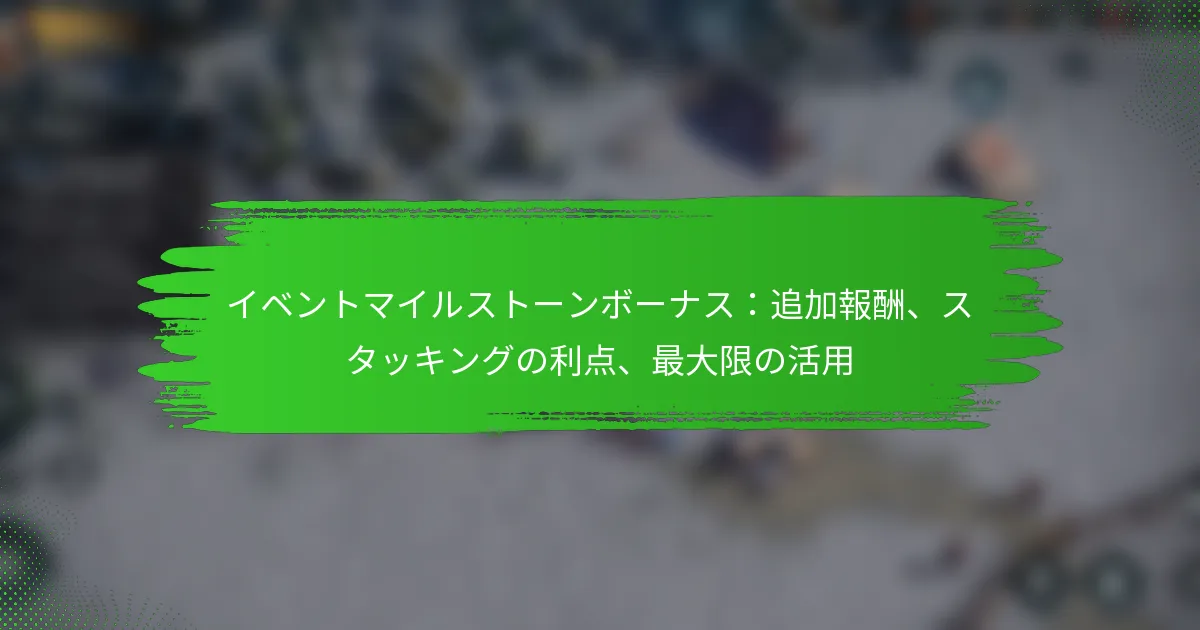 イベントのマイルストーンボーナスは、参加者がイベント中に特定の目標を達成することで得られる追加の報酬を提供し、より高いエンゲージメントとパフォーマンスを促進します。これらのボーナスには、現金インセンティブ、限定アイテム、経験値などが含まれ、全体的な体験を豊かにします。さまざまなイベントからこれらの報酬を戦略的に重ねることで、参加者は利益を最大化し、個人および財務の成長を促進できます。 イベントのマイルストーンボーナスとは? イベントのマイルストーンボーナスは、参加者がイベント中に特定の成果を達成した際に与えられる追加の報酬です。これらのボーナスは、参加者のエンゲージメントとパフォーマンスを促進し、全体的な体験を向上させます。 イベントのマイルストーンボーナスの定義と目的 イベントのマイルストーンボーナスは、参加者が定められた期間内に特定の目標を達成することを促すために設計された構造化された報酬です。これらは、個人の努力と貢献を認識することで動機付けを行い、最終的には競争的で魅力的な環境を育成します。 これらのボーナスの主な目的は、参加を促進し、イベントの全体的な成功を高めることです。具体的な報酬を提供することで、主催者は参加者のエンゲージメントと満足度を向上させ、参加者と主催者の両方にとってより良い結果をもたらします。 マイルストーンボーナスを提供するイベントの例 さまざまな種類のイベントがマイルストーンボーナスを取り入れることができます。これには、企業の研修セッション、販売競技、コミュニティチャレンジなどが含まれます。たとえば、販売チームは四半期の競技中に特定の販売目標を達成することでボーナスを受け取ることがあります。 他の例としては、参加者が特定の回数のワークアウトを完了したり、自己ベストを達成したりすることで報酬を得るフィットネスチャレンジがあります。これらのマイルストーンは、イベントの目標や構造に応じて大きく異なる場合があります。 イベントのマイルストーンボーナスが報酬システムにどのように組み込まれるか イベントのマイルストーンボーナスは、参加者の目標を組織の目的と一致させるため、報酬システムに不可欠です。これらのボーナスを統合することで、組織は成果を認識するためのより構造化されたアプローチを作成でき、動機付けとパフォーマンスの向上につながります。 さらに、これらのボーナスは、ポイントシステムや階層型報酬などの他の認識形式と重ねることができます。この利益の重ね合わせにより、参加者は時間をかけて報酬を蓄積し、全体的な体験を向上させ、継続的なエンゲージメントを促進します。 イベントのマイルストーンボーナスの一般的な別名 イベントのマイルストーンボーナスは、文脈や業界によってさまざまな名前で呼ばれることがあります。一般的な別名には、達成ボーナス、パフォーマンスインセンティブ、マイルストーン報酬などがあります。 これらの用語は意味がわずかに異なる場合がありますが、一般的にはイベント中に特定の目標を達成した参加者に報いるという同じ概念を指します。 イベントのマイルストーンボーナスの分類 イベントのマイルストーンボーナスは、イベントの種類や報酬の性質に基づいて分類できます。たとえば、ボーナスは金銭的報酬、ギフトカード、旅行やイベントへの独占アクセスなどの体験的報酬として分類できます。 これらのボーナスを分類する別の方法は、タイミングによるもので、迅速な成果に対する即時報酬や長期目標に対する累積報酬などがあります。この分類を理解することで、主催者は参加者の動機や好みに応じた効果的な報酬システムを設計できます。 どのような追加の報酬を得ることができるか? 追加の報酬は、イベントへの参加の全体的な体験を向上させ、標準的な提供物を超えたさまざまなインセンティブを提供します。これらの報酬には、現金ボーナス、割引、限定アイテム、経験値、個人および財務の成長に寄与するその他の形態の利益が含まれます。 現金ボーナスとその影響 現金ボーナスは、収入に大きな影響を与える直接的な金銭的報酬です。これらのボーナスは、イベント中に特定のマイルストーンを達成したり、特定の目標を達成したりすることで与えられることがあります。 ボーナスは、イベントの規模やパフォーマンスに応じて、小額からかなりの金額までさまざまです。 現金ボーナスの税務上の影響を考慮してください。居住地によっては所得税の対象となる場合があります。 タイミングが重要です。イベントの終了時にボーナスを受け取ることは、財務計画に影響を与える可能性があります。