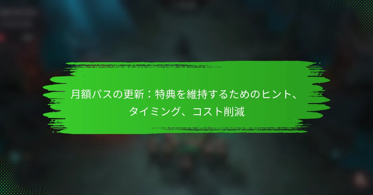 月額パスの更新は、特別な特典や途切れのないサービスへのアクセスを維持するために不可欠です。特典や節約を最大限に活用するために、期限前に更新し、利用可能な割引やロイヤルティプログラムを探してください。戦略的なタイミングで更新することで、コスト効果をさらに高め、パスに関連するすべての特典を引き続き楽しむことができます。 月額パスを維持することの主な利点は何ですか? 月額パスを維持することには、特別な特典へのアクセス、途切れのないサービス、そして向上したユーザー体験など、いくつかの利点があります。定期的にパスを更新することで、ロイヤルティボーナスを享受し、コミュニティイベントに参加することもできます。 特別な特典や割引へのアクセス 月額パスを持つユーザーは、時折利用するユーザーには提供されない特別な特典や割引にアクセスできることがよくあります。これには、サービスの料金が割引されること、プロモーションへの早期アクセス、または提携企業からの独占オファーが含まれることがあります。 例えば、一部の交通機関では月額パスユーザー向けに割引運賃を提供しており、ジムでは無料のクラスや商品を提供することがあります。パスをアクティブに保つことで、これらの特典を継続的に享受できます。 途切れのないサービスの提供 月額パスを更新することで、サービスの中断を経験することがないことが保証されます。これは、公共交通機関やサブスクリプションベースのプラットフォームなど、継続的なアクセスが必要なサービスにとって特に重要です。 パスを維持することで、アカウントの再アクティベーションやサービスの遅延に悩まされることがありません。この継続性は、全体的な体験を向上させ、活動を計画する際に心配することなく行えるようにします。 向上したユーザー体験と利便性 月額パスは、サービスへのアクセスを簡素化し、定期的に利用する際の利便性を高めます。パスを持っていると、通常、サービスを利用するたびにチケットを購入したり、個別に支払ったりする必要がありません。 この利便性は、時間と労力を節約し、スムーズな体験を可能にします。例えば、通勤者は現金やチケットを探すことなく公共交通機関に乗車でき、ジム利用者はフロントデスクでチェックインすることなく入場できます。 ロイヤルティボーナスやインセンティブの可能性 多くのサービス提供者は、月額パスを持つユーザーにロイヤルティボーナスを提供し、継続的な利用に対して報酬を与えています。これらのボーナスは、将来の更新時の割引や、無料のサービス月などの追加特典として提供されることがあります。 パスを継続的に更新することで、これらのインセンティブを利用できるようになり、時間の経過とともに大きな節約につながる可能性があります。特定のロイヤルティプログラムについては、常に提供者に確認してください。 コミュニティへの参加とイベントへの参加 月額パスを維持することで、パス保持者専用のコミュニティイベントや活動に参加できることがよくあります。これらのイベントは、特別なクラスやワークショップから、社交イベントやネットワーキングの機会まで多岐にわたります。 これらのイベントを通じてコミュニティと関わることで、全体的な体験が向上し、共通の興味を持つ他の人々とのつながりを育むことができます。参加には有効な月額パスが必要な今後のイベントについて、サービス提供者からの発表を探してください。 最適な特典を得るために月額パスをいつ更新すべきですか? 特典を最大限に活用するために、月額パスは期限前に更新してください。これにより、サービスへの途切れのないアクセスが保証され、利用可能なプロモーションを活用できます。 更新期限と猶予期間の理解 更新期限は提供者によって異なりますが、通常は期限の数日前にパスを更新することを目指すべきです。多くのサービスでは、数日から数週間の猶予期間を提供しており、これにより中断することなくパスを使用し続けることができます。 更新期限を逃すと、蓄積された特典や割引を失う可能性があることに注意してください。驚きを避けるために、猶予期間に関する提供者のポリシーを確認してください。 更新日から1週間前にリマインダーを設定することをお勧めします。これにより、プロセスを完了するための十分な時間が確保できます。 プロモーションオファーと一致させるための更新タイミング